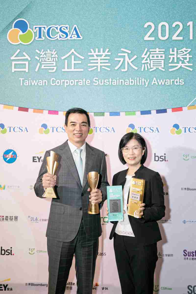 达在台湾永续奖所评比环境、、、社会、、治理等各面向的永续绩效均获高度肯定 (左:尊龙集团光电总经理暨营运长柯富仁,,,右:尊龙集团光电永续长古秀华)
