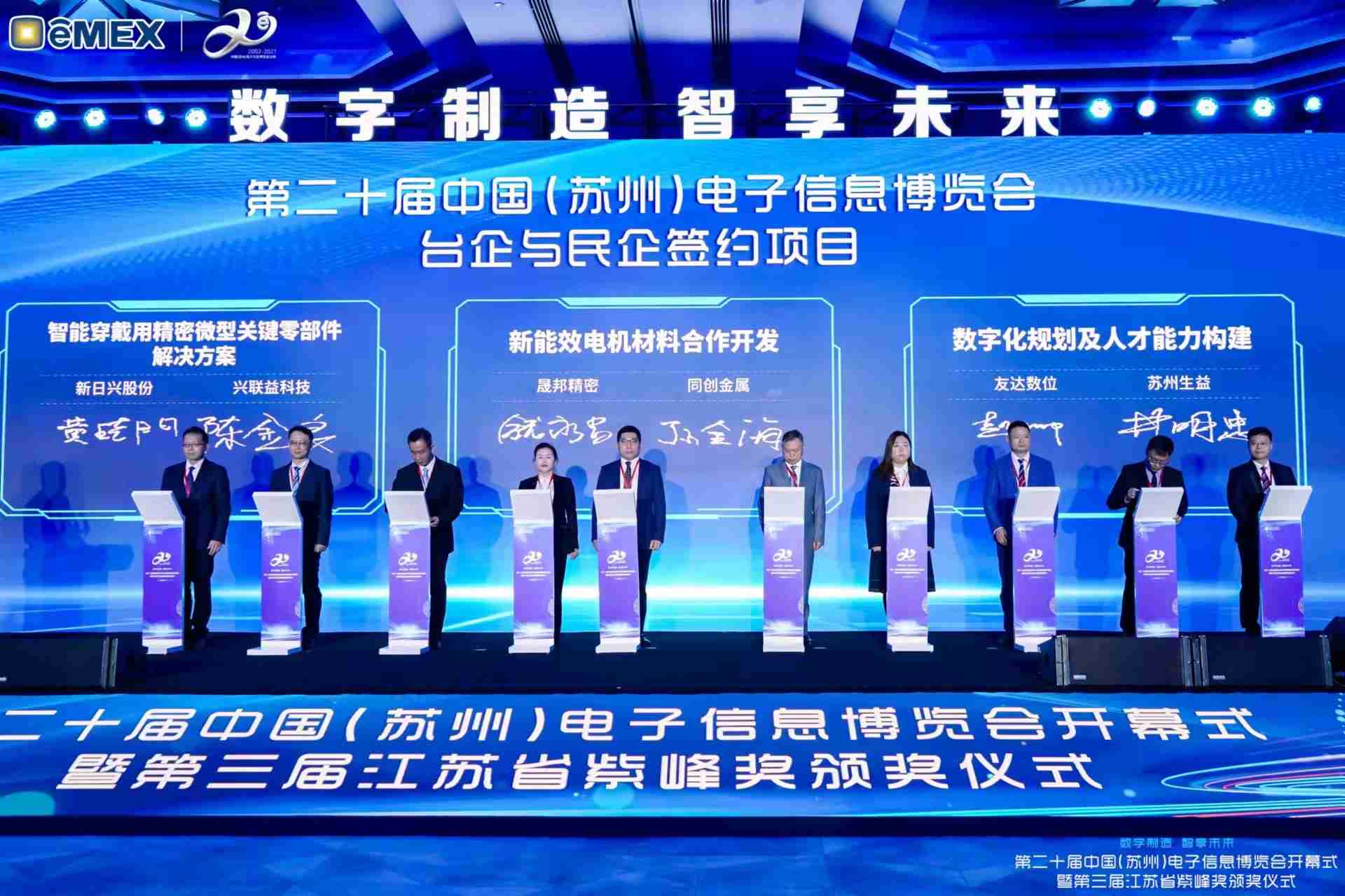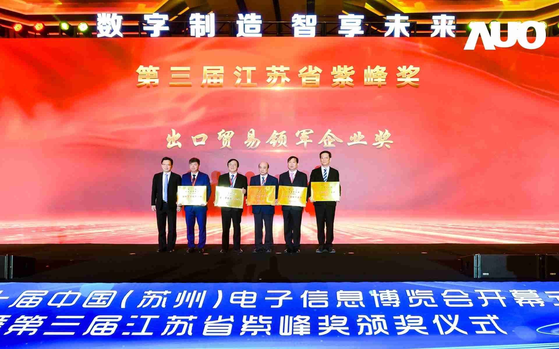 电博会开幕式当天也是第三届江苏省紫峰奖颁奖仪式,,省台办、、工信厅、、、商务厅、、苏州市相关领导均出席并颁奖。。。该奖项为表彰对江苏高质量发展做出积极贡献的在苏企业,,由江苏省政府专门设立。。。。尊龙集团光电 (苏州) 总经理郭振明代表上台领奖,,,,这也是尊龙集团苏州连续三次蝉联紫峰奖 出口贸易领军企业奖。。。。尊龙集团数位总经理赵丽娜女士,,,也参与本次开幕式,,上台为本地化赋能签署战略合作协议,,,将优质服务资源集合、、、下沉到更多细分行业,,,为更多地区的制造企业提供数字化转型服务。。。。