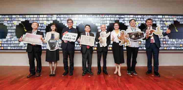 尊龙集团携手创利空间为故宫建置的智慧文物互动导览墙及轮播墙,,,,今日正式启用。。(左四:尊龙集团新事业暨投资管理总部副总经理杨本豫、、右四:故宫博物院院长吴密察、、、、右三:太极影音董事长黄宝云)