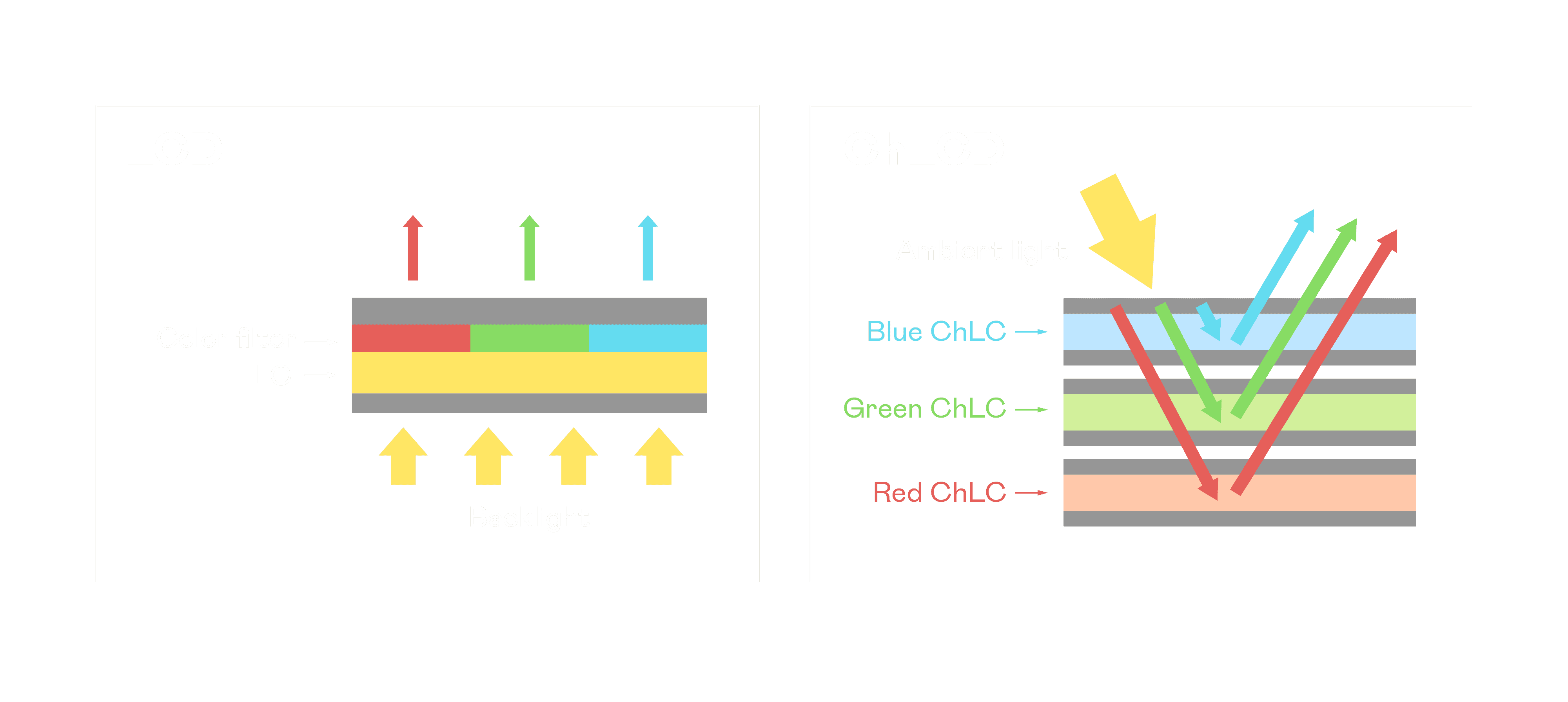 ChLCD 胆固醇液晶就如同纸张一样,,透过反射环境光来显示影像,,,因此长时间观看不易造成人眼视觉疲劳,,,,可达到护眼效果。。。。当处于户外阳光下使用,,,LCD 影像容易失真而不易观看,,,,但胆固醇液晶仍可维持较佳的影像品质。。