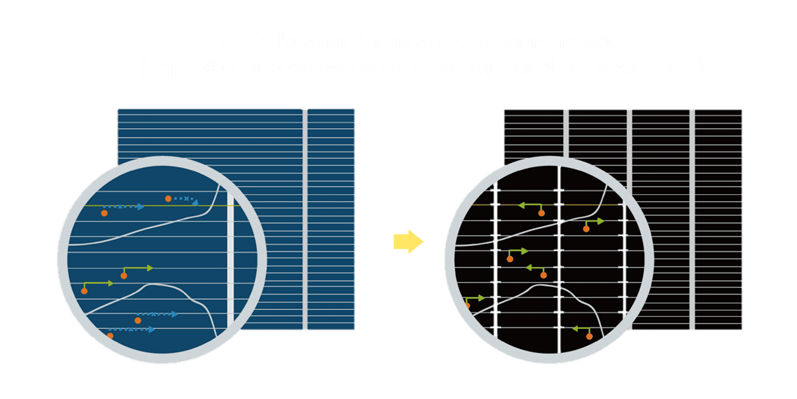 - 电池使用多条铜导线 (Copper wire) 于电池片上形成较短的电流路径,,,提高电流收集效率,,,,采用圆形设计的铜导线较传统扁平式的铜焊带 (Ribbon),,,,可增加入射至电池的光线量。。。